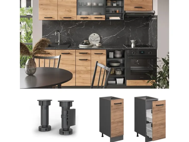 Das Küchenmöbel besteht aus pflegeleichter Spanplatte 16 mm, mit einer Melaminharzbeschichtung