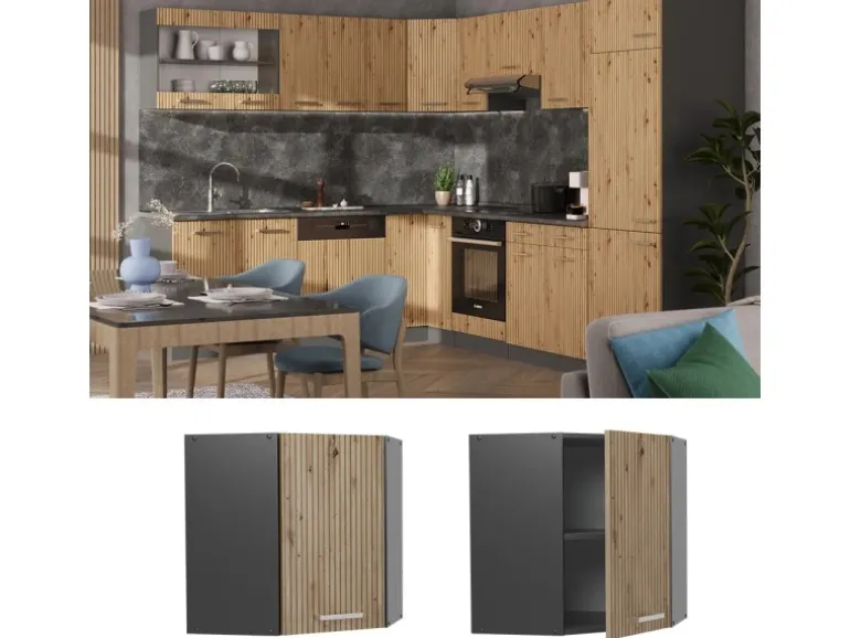 Das Eckregal für die Küche hat Abmessungen: 57 cm, Breite, 60 cm, Höhe, 34,1 cm, Tiefe