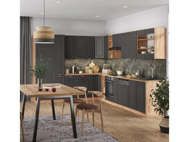Die Winkelküche besteht aus pflegeleichter Spanplatte 16 mm, mit einer Melaminharzbeschichtung