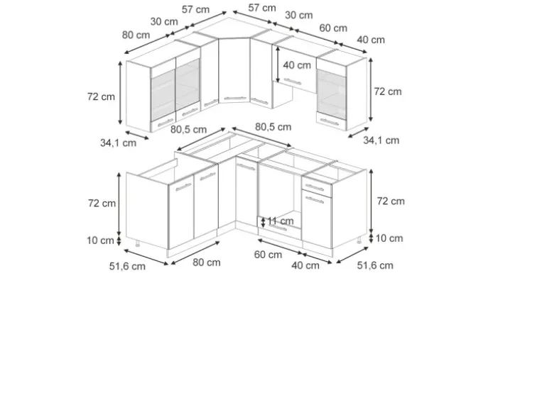 Die Eckküche hat eine Breite 160,5 x 190 cm, eine Höhe 82 cm und eine beidseitige Tiefe 60 cm