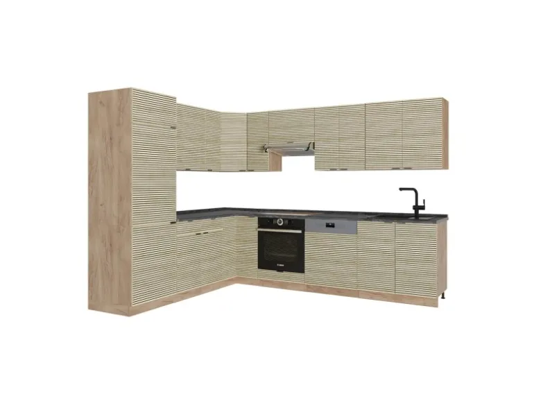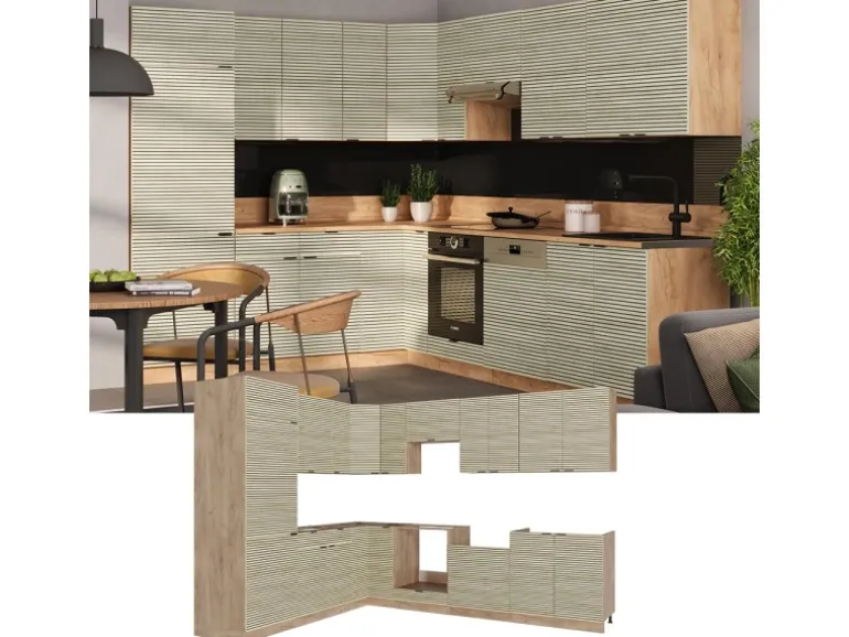 Die Küche in L-Form bietet zusätzliche Module und ein umstellbares Design nach Belieben