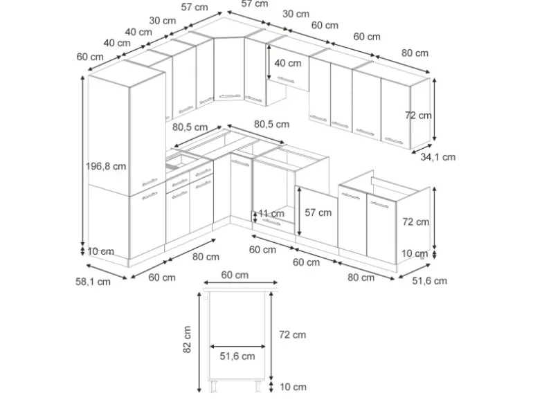 Die Küche L Form hat eine Breite von 227×287 cm, eine Höhe von 82 cm und eine Tiefe von 52 cm