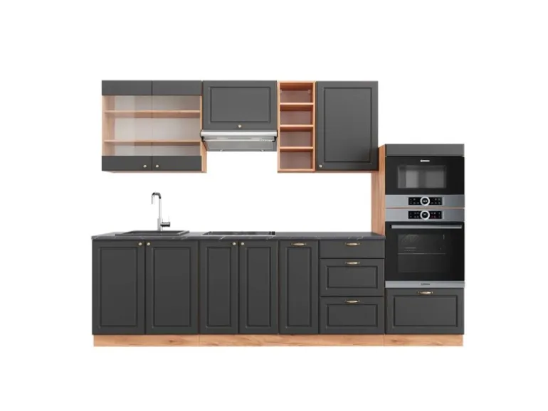 Das Küchenmöbel hat eine Breite von 280 cm, eine Höhe von 82 cm und eine Tiefe von 60 cm