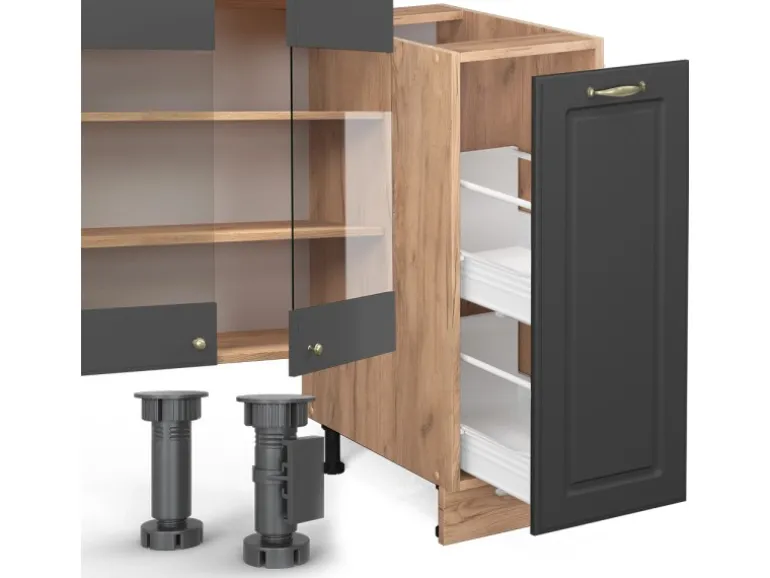 Der Küchenblock Fame-Line besteht aus Spanplatten mit Melaminharzbeschichtung und MDF-Material