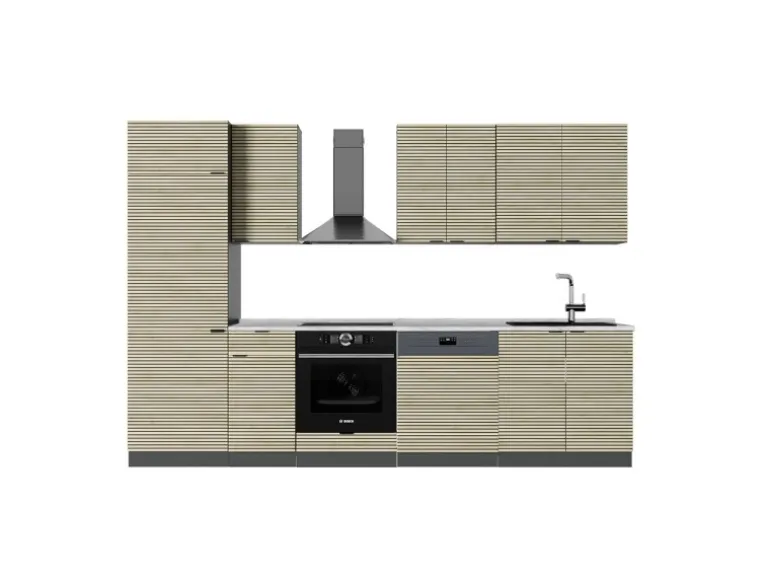 Die Einbauküche hat eine Breite von 300 cm, eine Höhe von 82 cm und eine Tiefe von 52 cm