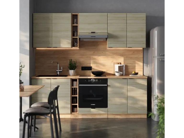 Das Küchenmöbel hat eine Breite von 235 cm, eine Höhe von 82 cm und eine Tiefe von 60 cm
