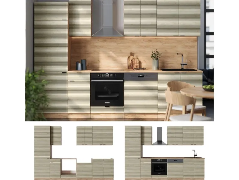 Die Einbauküche hat eine Breite von 300 cm, eine Höhe von 82 cm und eine Tiefe von 52 cm