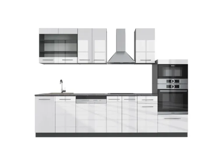 Das Küchenmöbel hat eine Breite von 300 cm, eine Höhe von 82 cm und eine Tiefe von 52 cm