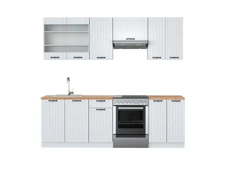 Das Küchenmöbel hat eine Breite von 240 cm, eine Höhe von 82 cm und eine Tiefe von 60 cm