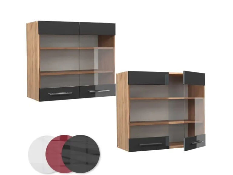 Die Hängevitrine hat Breite 80 cm, Höhe 72 cm und Tiefe 34,1 cm