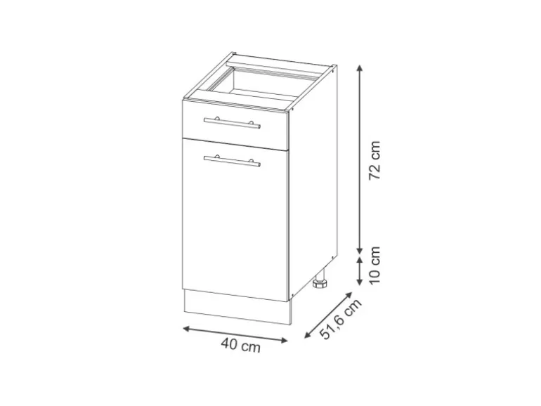 Der Schubladenunterschrank hat Breite 40 cm, Höhe 82 cm und Tiefe 51,6 cm