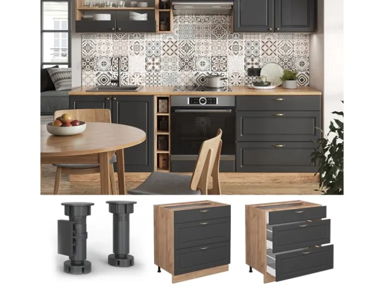 Der Schubladenunterschrank hat Breite 80 cm, Höhe 82 cm und Tiefe 51,6 cm