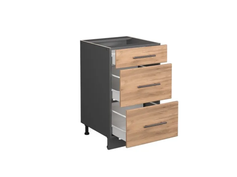 Der Schubladenunterschrank hat Breite 50 cm, Höhe 82 cm und Tiefe 51,6 cm