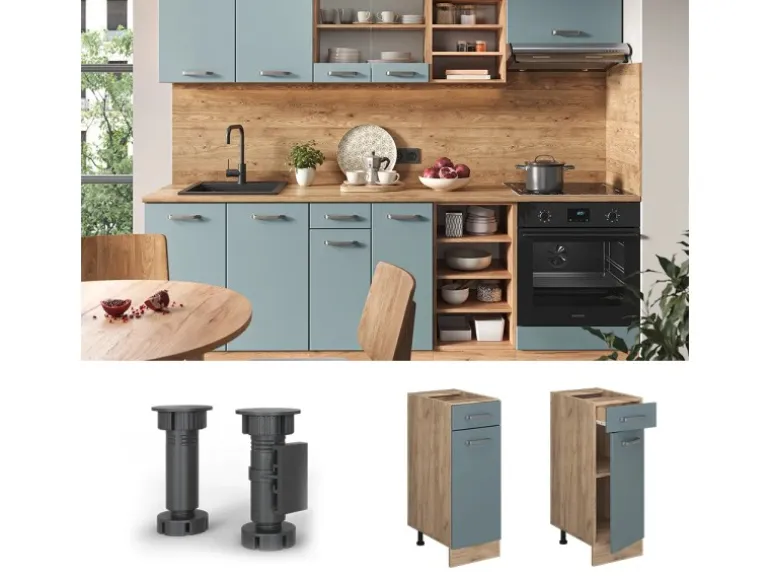 Das Küchenmöbel besteht aus pflegeleichter Spanplatte 16 mm, mit einer Melaminharzbeschichtung