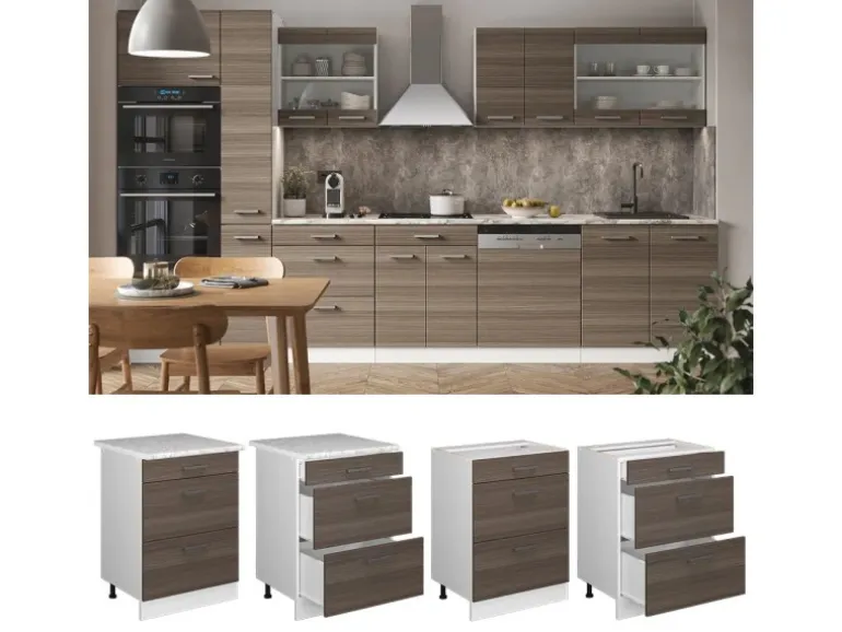 Das Küchenmöbel besteht aus pflegeleichter Spanplatte 16 mm, mit einer Melaminharzbeschichtung