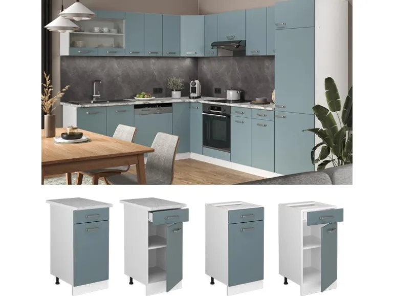 Das Küchenmöbel besteht aus pflegeleichter Spanplatte 16 mm, mit einer Melaminharzbeschichtung