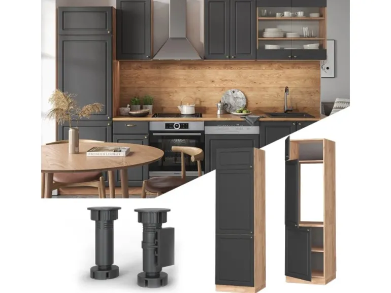 Der Küchenschrank für den Kühlschrank hat Breite 60 cm, Höhe 206,8 cm und Tiefe 58 cm