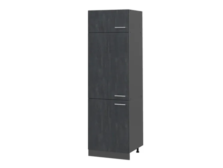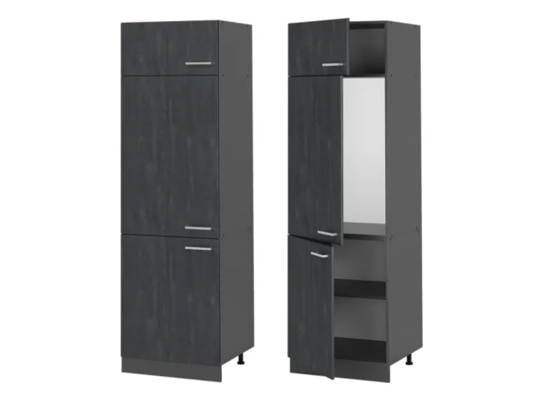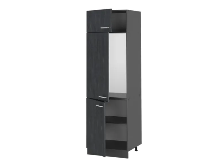 Der Küchenhochschrank besteht aus pflegeleichter, melaminharzbeschichteter 16 mm Spanplatte.