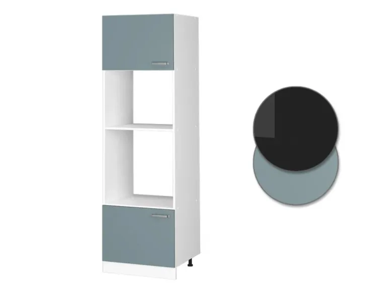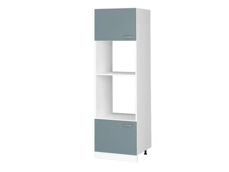 Der Küchenhochschrank besteht aus pflegeleichter, melaminharzbeschichteter 16 mm Spanplatte.