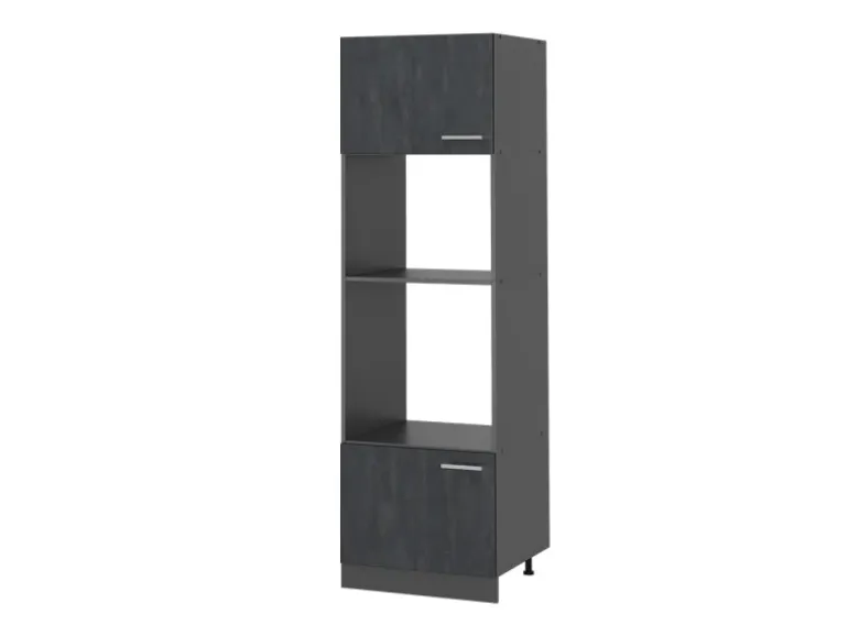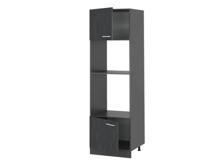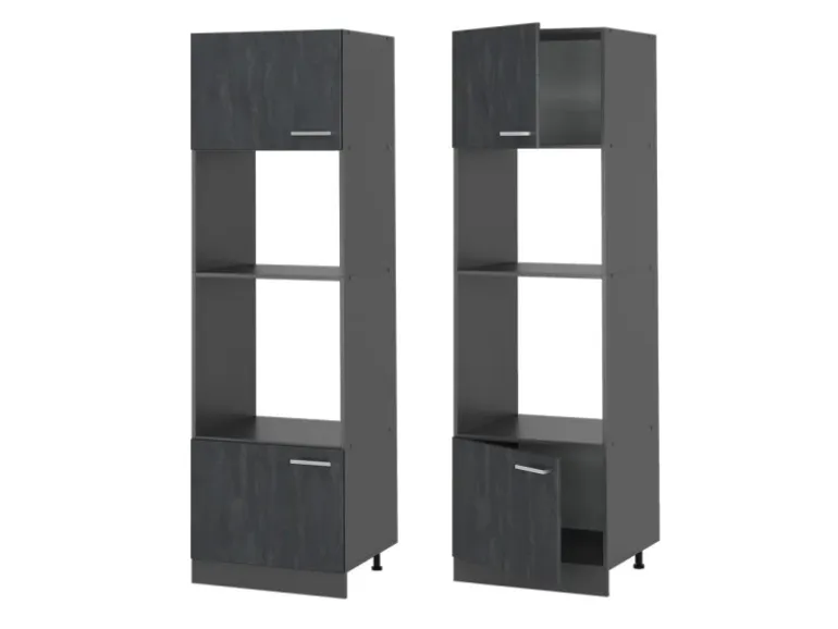 Der Küchenhochschrank besteht aus pflegeleichter, melaminharzbeschichteter 16 mm Spanplatte.