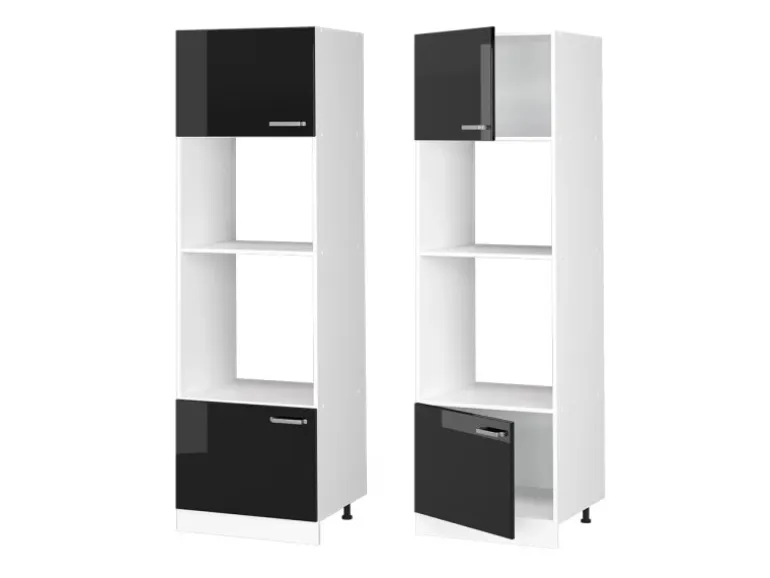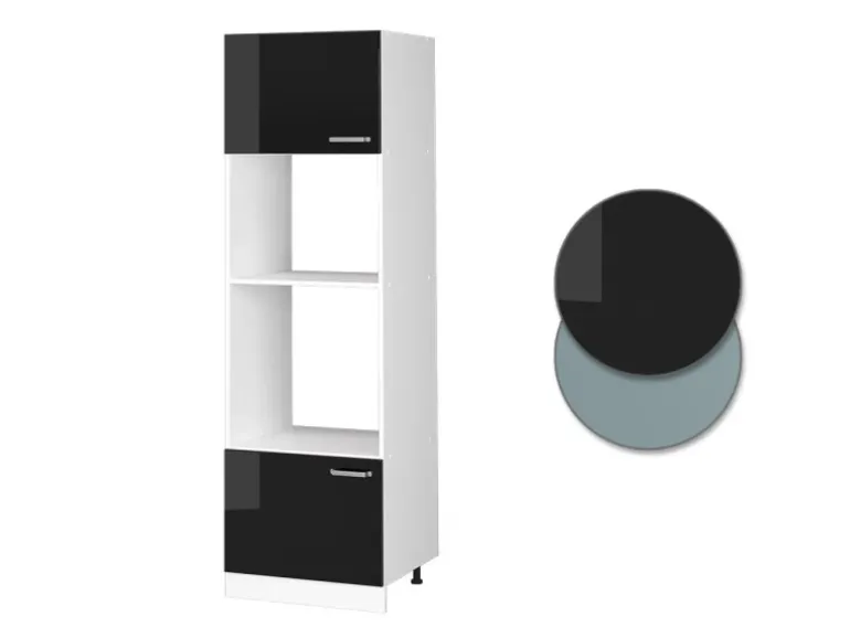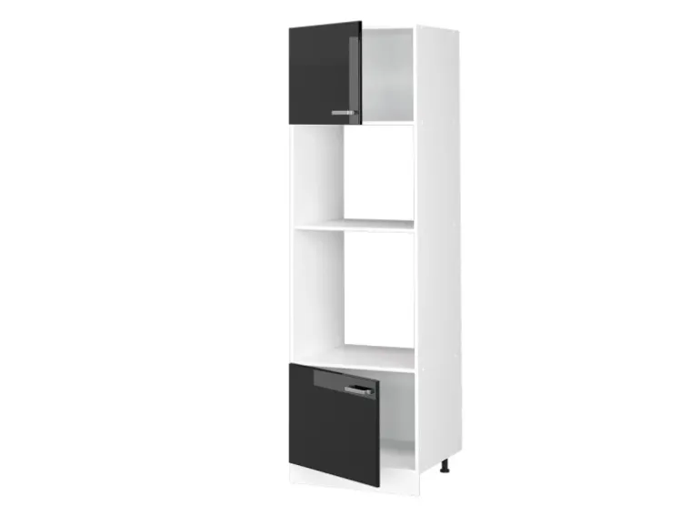 Der Küchenhochschrank besteht aus pflegeleichter, melaminharzbeschichteter 16 mm Spanplatte.