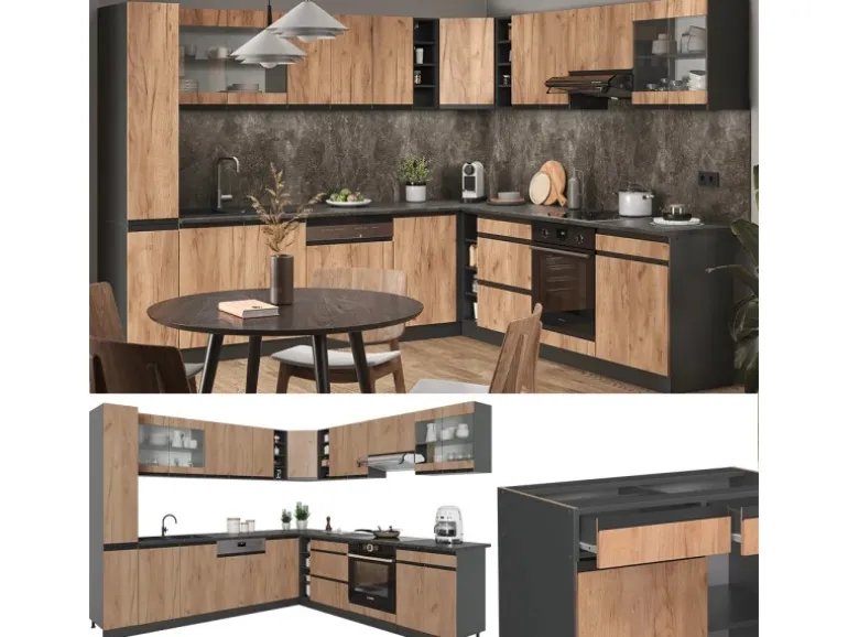 Die Küche in L-Form bietet zusätzliche Module und ein umstellbares Design nach Belieben