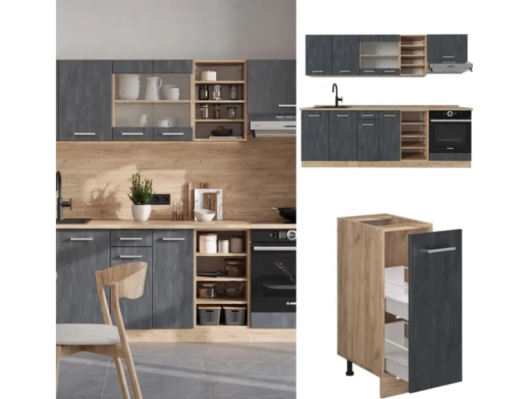 LIEFERUMFANG: Küchenzeile als Bausatz, Arbeitsplatte, Montageanleitung, Montagematerial.