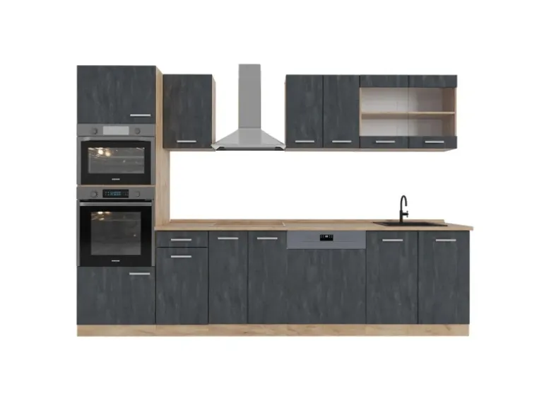 Die Einbauküche mit Hochschrank hat eine Breite 300 cm, eine Höhe 206,8 cm und eine Tiefe 57,2 cm