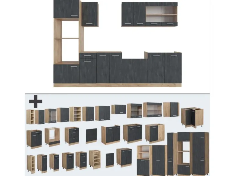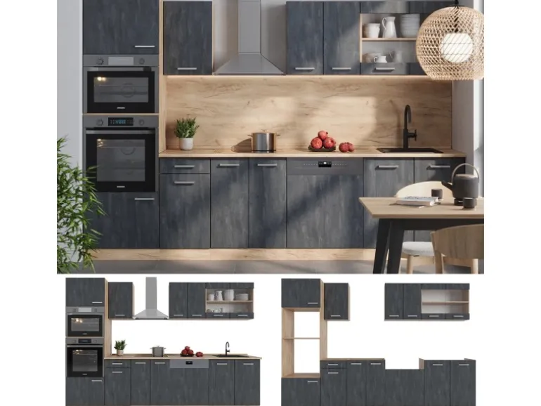 LIEFERUMFANG: Küchenzeile als Bausatz, Arbeitsplatten, Montageanleitung, Montagematerial.