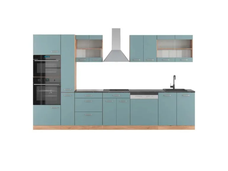 Das Küchenmöbel hat eine Breite von 350 cm, eine Höhe von 206,8 cm und eine Tiefe von 60 cm