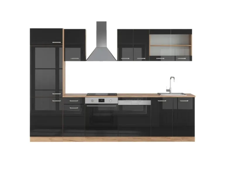 Die Küchenzeile hat eine Breite von 300 cm, eine Höhe von 206,8 cm und eine Tiefe von 57,2 cm