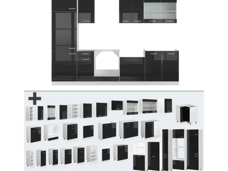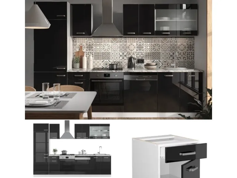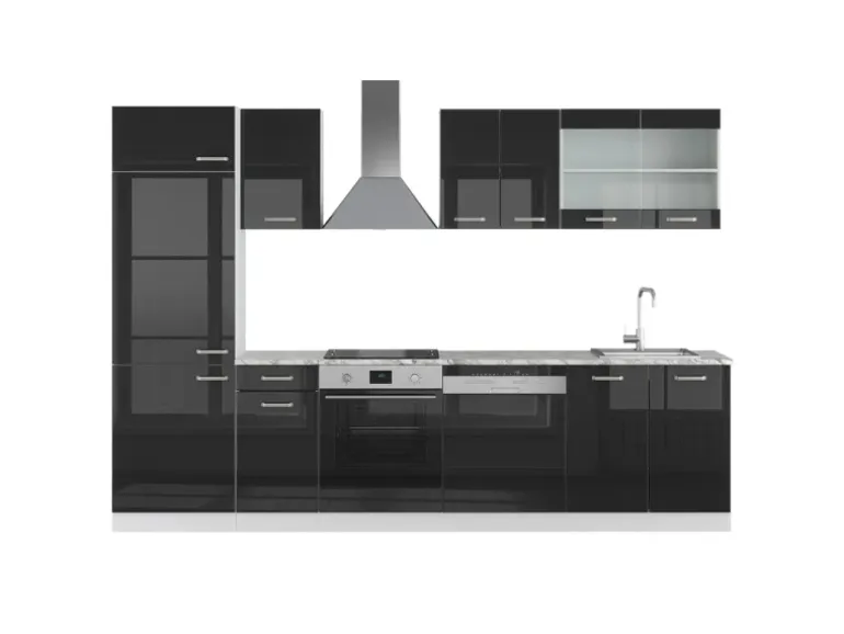 Die Küchenzeile hat eine Breite von 300 cm, eine Höhe von 206,8 cm und eine Tiefe von 57,2 cm