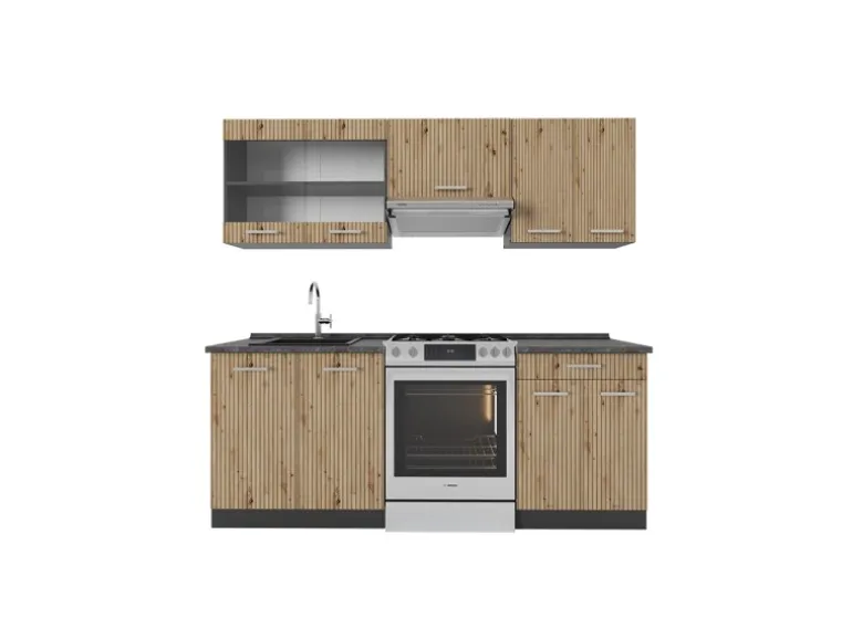 Das Küchenmöbel hat eine Breite von 200 cm, eine Höhe von 82 cm und eine Tiefe von 60 cm