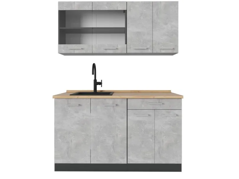 Der Küchenblock hat eine Breite von 140 cm, eine Höhe von 81,6 cm und eine Tiefe von 60 cm