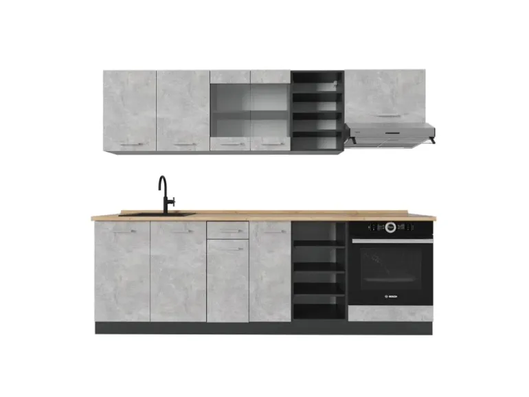 Das Küchenmöbel hat eine Breite von 240 cm, eine Höhe von 82 cm und eine Tiefe von 46 cm