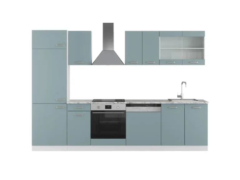 Die Küchenzeile mit Arbeitsplatte hat eine Breite 300 cm, eine Höhe 206,8 cm und eine Tiefe 60 cm