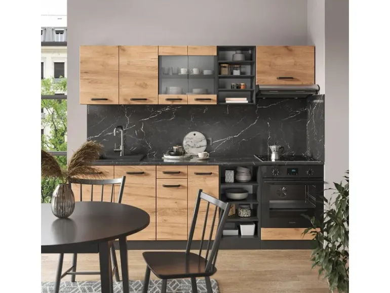 Das Küchenmöbel hat eine Breite von 240 cm, eine Höhe von 81,6 cm und eine Tiefe von 60 cm