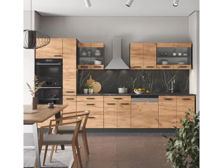 Das Küchenmöbel hat eine Breite von 350 cm, eine Höhe von 207 cm und eine Tiefe von 46 cm