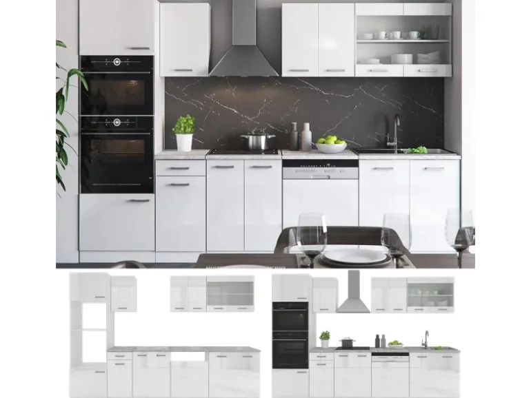 Das Küchenmöbel hat eine Breite von 300 cm, eine Höhe von 207 cm und eine Tiefe von 60 cm