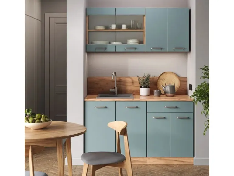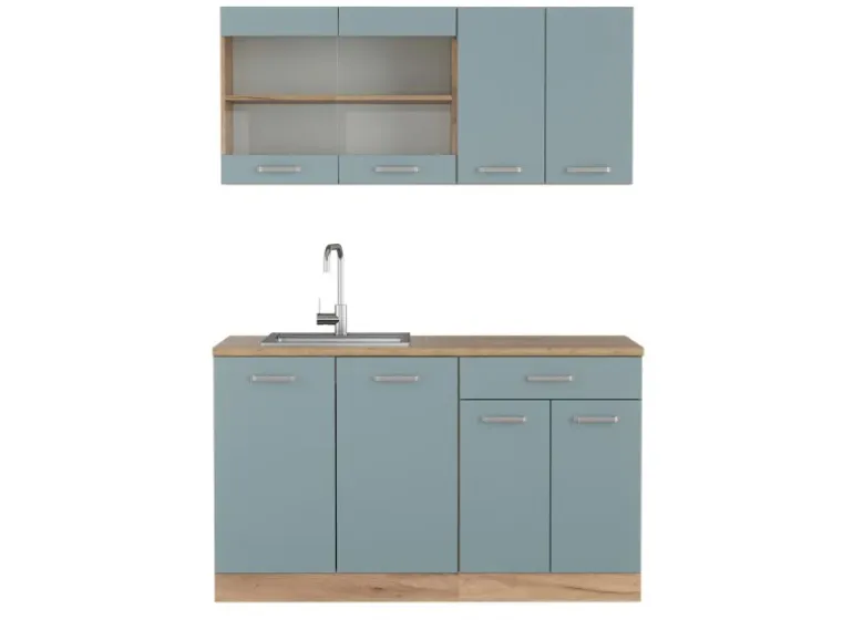 Der Küchenblock besteht aus pflegeleichter, melaminharzbeschichteter 16 mm Spanplatte.