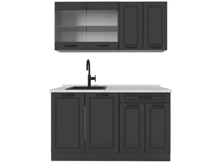 Der Küchenblock hat eine Breite von 140 cm, eine Höhe von 81,6 cm und eine Tiefe von 60 cm