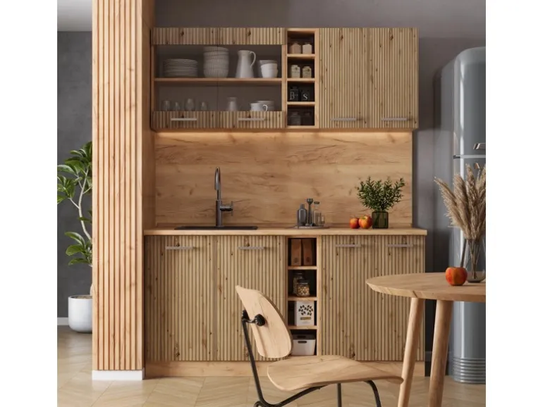 Der Küchenblock besteht aus pflegeleichter Spanplatte 16 mm, mit einer Melaminharzbeschichtung