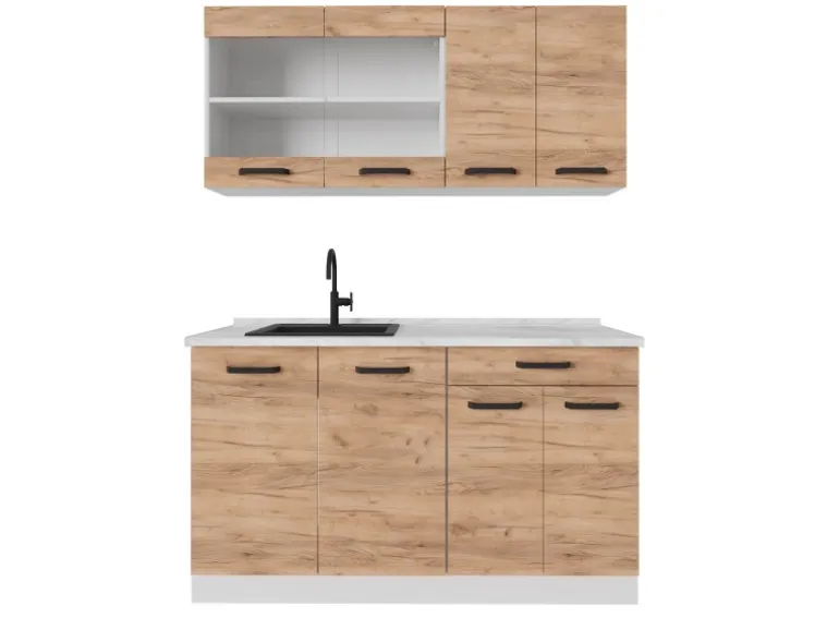 Der Küchenblock hat eine Breite von 140 cm, eine Höhe von 81,6 cm und eine Tiefe von 60 cm