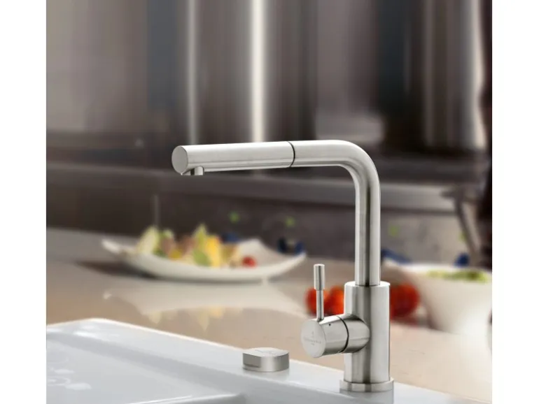 Villeroy & Boch bietet mit der Steel Shower eine Küchenarmatur mit moderner, gerader Linienführung und komfortabler Höhe. Der Einhandmischer mit herausziehbarer Schlauchbrause hat einen Schwenkbarkeitsgrad von 360° ✔ für einen maximalen Aktionsradius. Durch den großen Bewegungsspielraum können Behälter jeder Art und Größe uneingeschränkt befüllt werden. Gefertigt ist die Armatur aus hochwertigem, robustem Edelstahl, der dauerhaft vor Kalk und Rost schützt und lange Freude am Produkt garantiert. Das gebürstete Edelstahl-Finish ist resistent gegen Fingerabdrücke und Fettflecken und somit sehr pflegeleicht. Die Armatur enthält eine qualitativ hochwertige und langlebige Keramikkartusche sowie flexible und geschmacksneutrale Anschlussschläuche. Das Villeroy & Boch-Fixierungssystem ermöglicht eine schnelle und einfache Installation in jedem Zuhause.