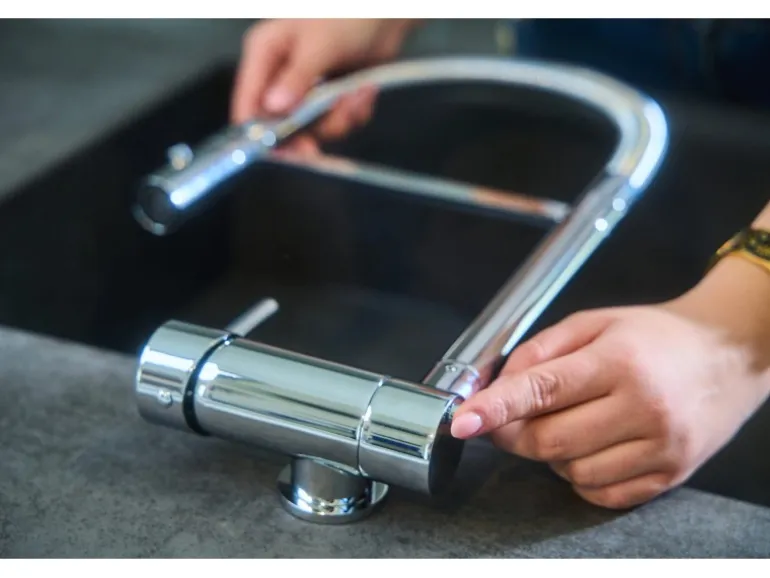 Schwenkbarem und umklappbarem Auslauf für Vorfenster-Montage um eine Höhe von nur 6 cm zu erreichen