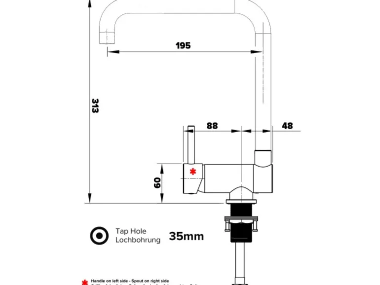 Auslauf um 360° schwenkbar // Bedien-Hebel: links