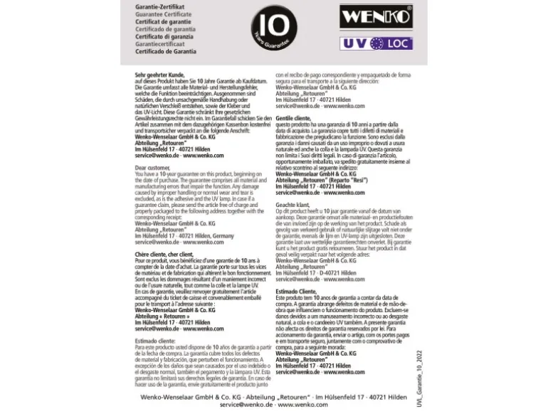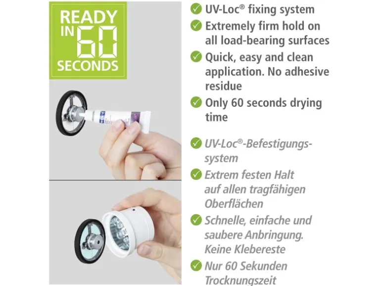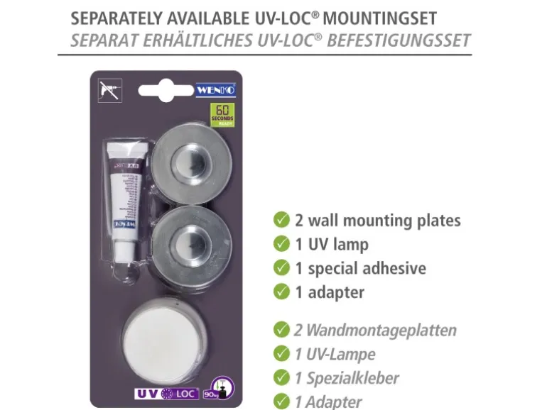 Alternativ kann die Wenko Eckablage Trestina auch stressfrei ohne Bohren befestigt werden – das gelingt Ihnen in Minutenschnelle mit dem innovativen UV-Loc® Klebesystem von Wenko. Mittels Spezialkleber und UV-Lampe bekommen Sie das Bad-Accessoire in nur 60 Sekunden an die Wand. Diese Weltneuheit gewährleistet eine schnelle und saubere Anbringung mit extrem festem und zuverlässigem Halt auf allen tragfähigen Flächen. Das UV-Loc®-Befestigungsset ist separat erhältlich.