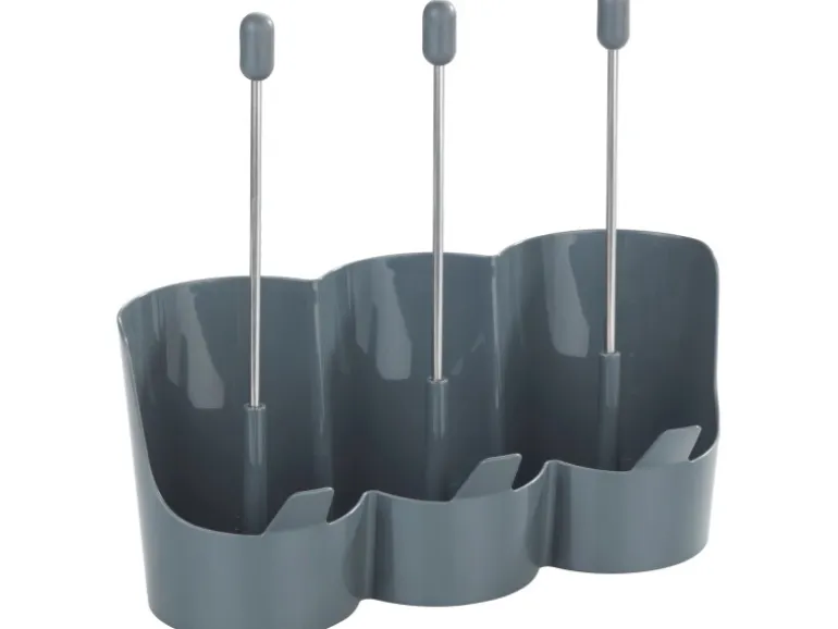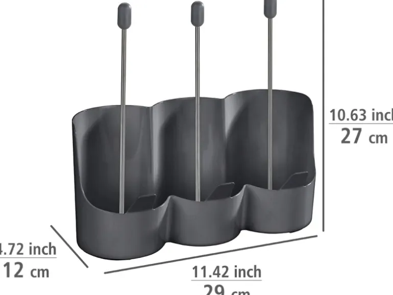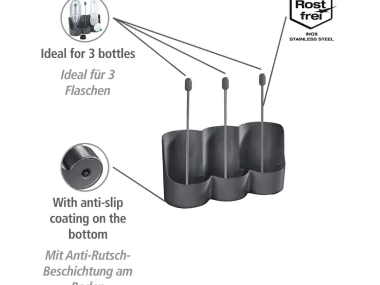 Machen Sie sich das Leben leichter mit dem praktischen Flaschenhalter von Wenko. Die schwarze Flaschenhalterung aus robustem ABS-Kunststoff bewahrt Wasserflaschen und viele andere Getränkeflaschen geordnet und sicher während des Trocknens auf. Ein Must-Have für jede gut organisierte Küche. Der praktische Alltagshelfer mit Anti-Rutsch-Beschichtung am Boden hat einen rutschfesten Stand auf der Spüle sowie der Arbeitsplatte. Die Haltevorrichtung für 3 Deckel sorgt dafür, dass diese nicht verloren gehen. Durch das schwarze und offene Design, kombiniert mit silberfarbenen Stäben, ist der Flascheninhalt stets ein Blickfang.
