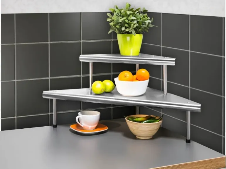 Vor allem für Gewürze, Kräuter und Küchen-Accessoires ist das edle Küchen-Eckregal perfekt geeignet. Durch die schöne und schlichte Edelstahl-Optik passt es sich dem Küchendesign perfekt an.