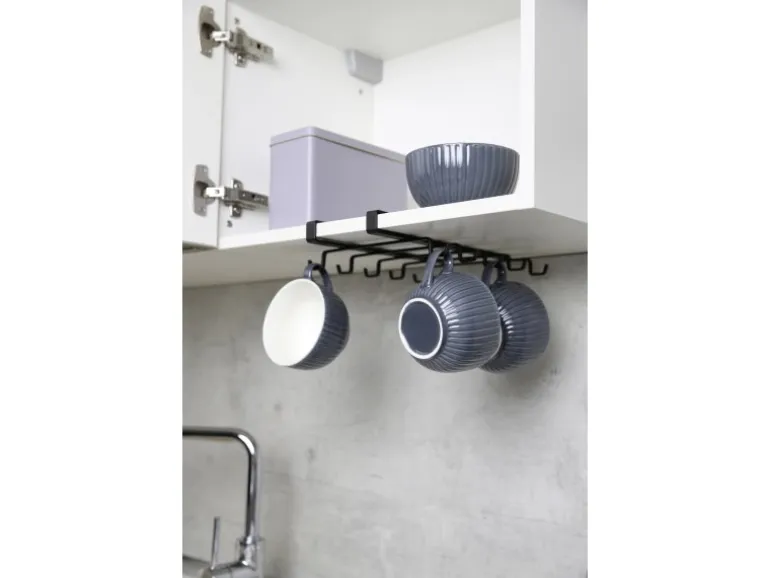 Das lästige Bohren in Schränken oder an Regalen entfällt, da der Schrankeinbau einfach über das Regalbrett gestülpt wird. Schon hängen die Tassen sicher und gerade. Die Aufhängung ist rutschsicher und aus stabilem Metall gefertigt.